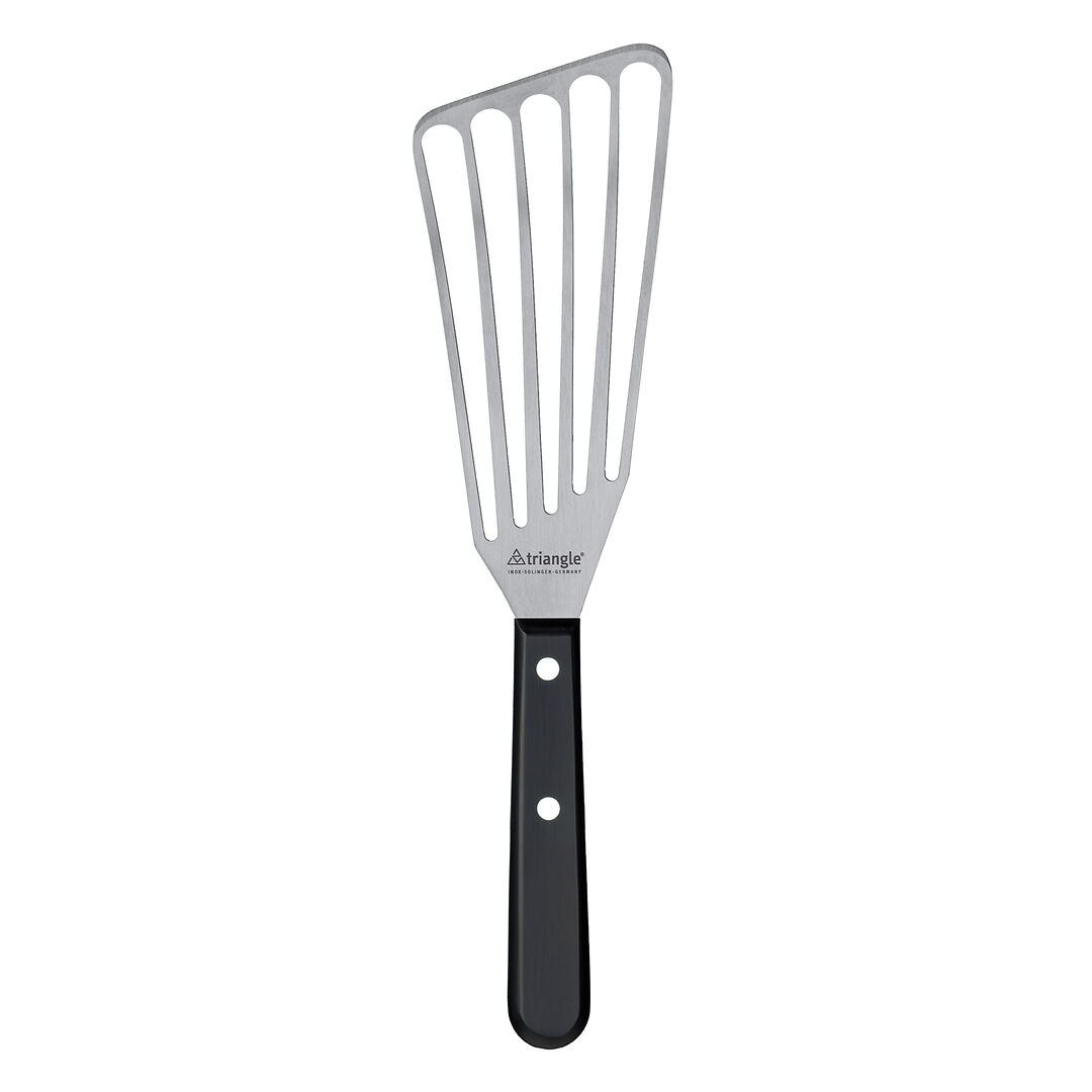 Flexible slotted spatula for professional use with hand riveted handle and matt finish. triangle spatulas are hardened and ground thinner towards the tip. Therefore they are thin, springy and flexible at the functional area but firm and string at the rear part. The high-quality ABS handle is hand riveted, trimmed and polished according to the Solingen craftsman's tradition. Hand wash recommended. Stainless Steel. Made in Solingen / Germany.