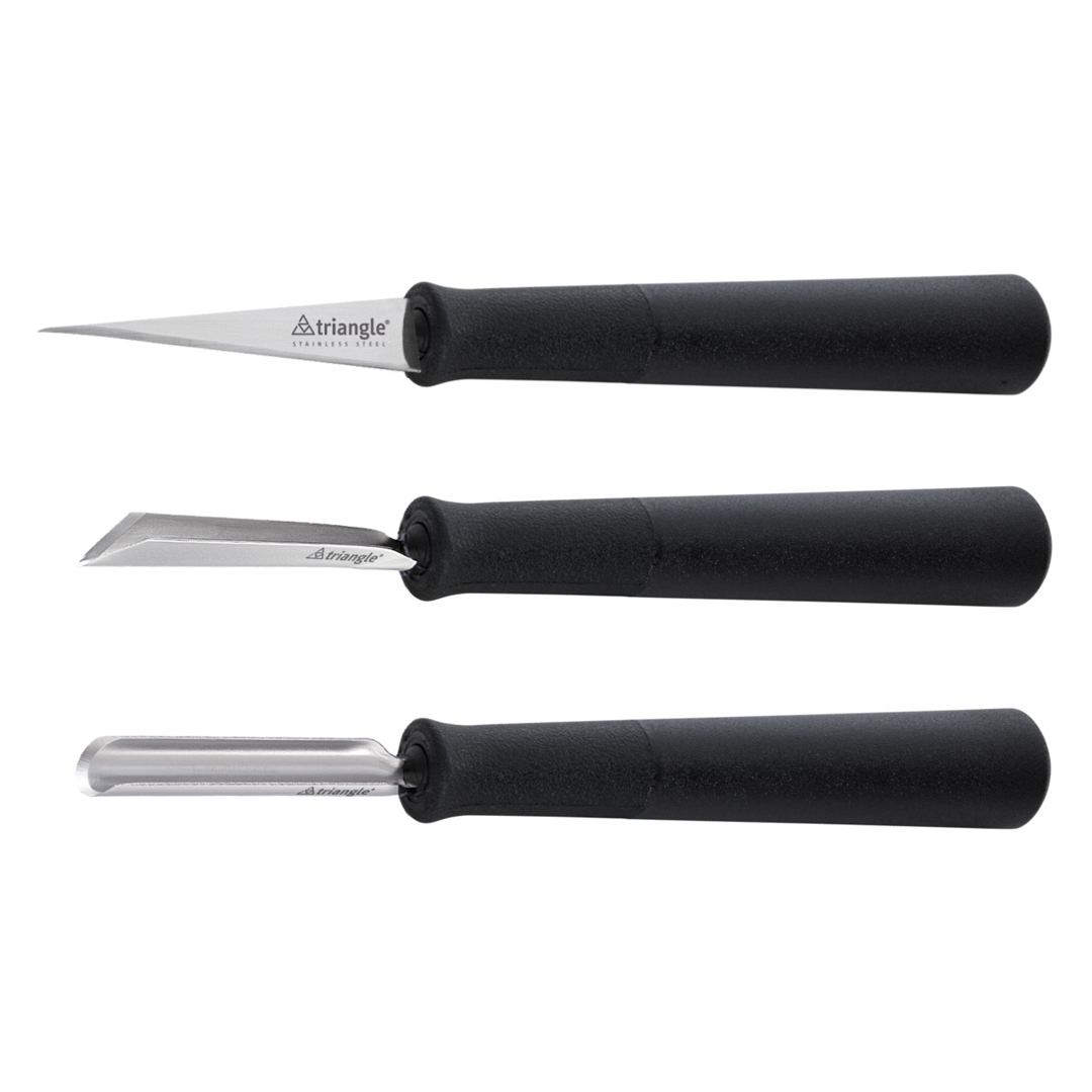 triangle Schlingenmesser eignen sich insbesondere zum Schnitzen von dreidimensionalen Kunstwerken aus Lebensmitteln. Die Funktionsteile bestehen aus gehärtetem, rostfreien Stahl, sind sorgfältig gearbeitet und perfekt geschärft. Die Griffe werden aus einer Kombination von hochwertigem Polypropylen und griffigem Santoprene gefertigt.