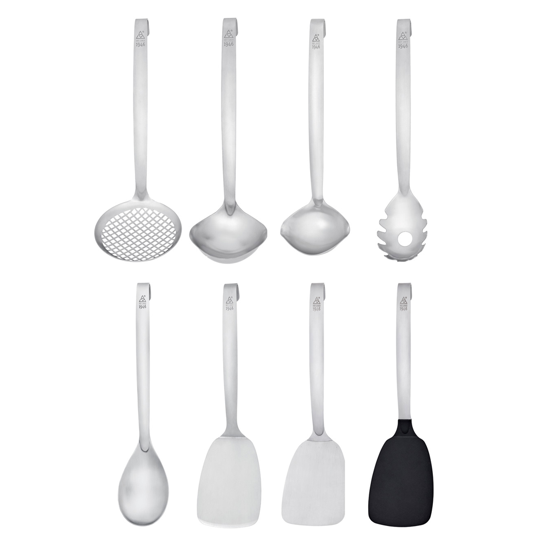 Spaghettilöffel „1946“. Zu dieser Serie gehören Küchenhelfer für jeden Tag, sämtlich neu durchdacht und einzigartig in ihrer Handhabung. Aus gebürstetem 18/10 Edelstahl und mit einer massiven Materialstärke sind sie unverwüstlich und bestreiten den rauen Gastronomiealltag ebenso souverän wie sie am Buffet und im Haushalt durch Ihre Formschönheit beeindrucken. „1946“ vereint triangles Kernwerte Qualität, Funktionalität und Nachhaltigkeit in Perfektion. Und so wäre auch Firmengründer Erwin Hill, der 1946 den Grundstein zu triangle legte, stolz auf diese Serie gewesen und hat so zu ihrem Namen inspiriert. Rostfrei und spülmaschinengeeignet.