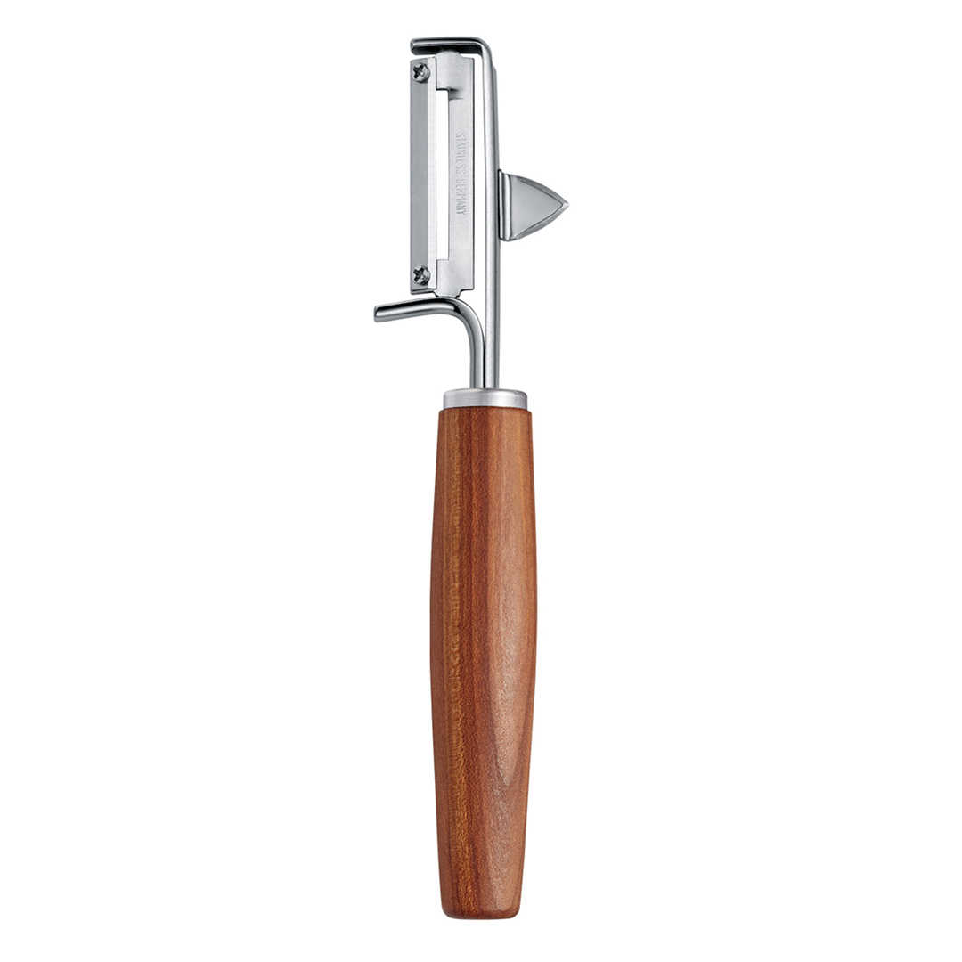 Klassischer Pendelschäler Sense für Rechtshänder oder für Linkshänder zum sparsamen Schälen von Gemüse und Obst mit mittlerer Schälstärke. Sollte die hochwertige Klinge einmal stumpf werden, ist sie austauschbar. Für die Serie Sense verwendet triangle regionales Pflaumenholz und unterstützt damit eine nachhaltige Holzwirtschaft und kurze Transportwege. Die Griffe werden im Sauerland gedrechselt, anschließend in Solingen fein bearbeitet und mit Funktionsteilen aus Edelstahl konfektioniert. Gefertigt wird selbstverständlich mit Ökostrom. Hergestellt in Solingen / Deutschland. Der Pendelschäler Sense wird in einem stilvollen und wieder verwendbaren Geschenkkarton geliefert.