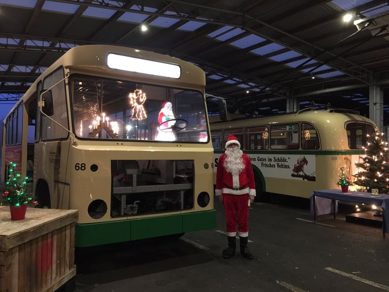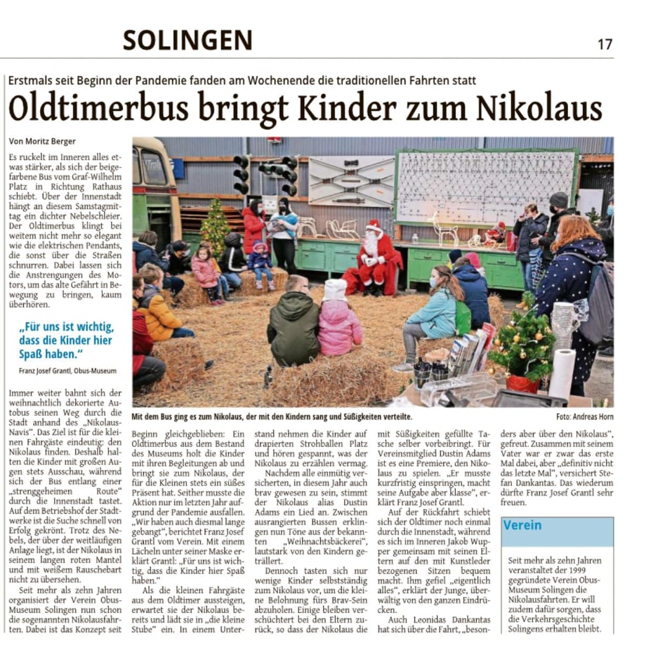 Das ist aber noch nicht alles: Unser Mitarbeiter Dustin Adams ist Mitglied im Verein Obus-Museum Solingen. Zuletzt begeisterte er viele Kinder als Weihnachtsmann verkleidet an den sogenannten Nikolausfahrten, die restlos ausverkauft waren. Insgesamt 14 Fahrten wurden am 3. Adventswochenende im Wagen 151 aus dem Jahre 1982 gemacht. Dabei wurde er beinahe von seinem eigenen Sohn erkannt, aber nur beinahe! Wir finden sein ehrenamtliches Engagement ganz toll. Weiter so!