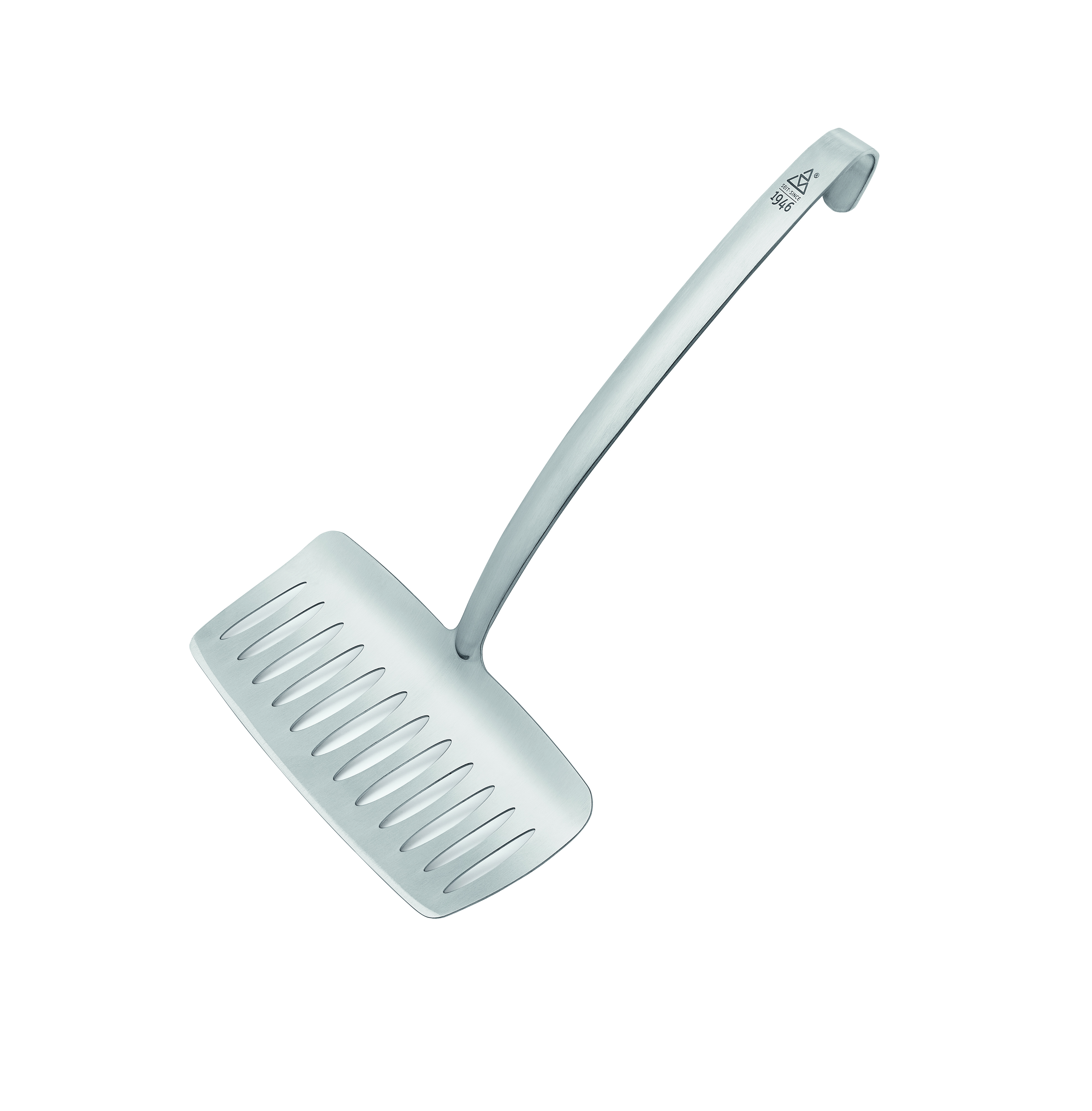 Für dieses Rezept passt der triangle Spargelschäler besonders gut, weil seine Konstruktion auf die empfindliche Struktur von Spargel ausgelegt ist. Ein kleiner Abweiser sorgt dafür, dass sich gelöste Schale nicht wieder an die Stange anlegt. Die zangenartige Form stützt den Spargel und hilft, Bruch zu vermeiden. Praktisch im Alltag: Die Klinge lässt sich für Links- und Rechtshänder umstecken, sie besteht aus gehärtetem, rostfreiem Stahl und ist bei Bedarf auswechselbar. Sie lässt sich außerdem schnell in Wasser von Fasern befreien.Zum Herausheben und Servieren eignet sich die Fisch- und Spargelpalette 1946. Sie ist der praktische Helfer zum Wenden und Servieren empfindlicher Speisen wie Fisch und Spargel; durch die Schlitze können Fett und Kochflüssigkeit ablaufen. Die Serie 1946 besteht aus gebürstetem 18/10 Edelstahl und ist rostfrei und spülmaschinengeeignet.